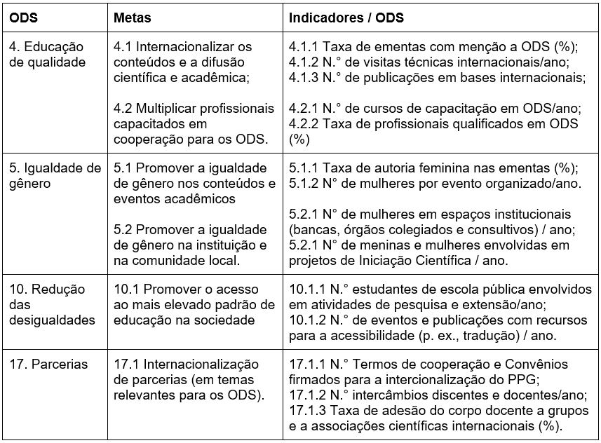ODS 4) Educação de Qualidade: O Mestrado vem alinhando a sua Estrutura Curricular aos Objetivos de Desenvolvimento Sustentável (ODS) e ampliando a visibilidade social e acadêmica das suas ações e da sua produção intelectual (docente, discente e de egressos) do plano local ao internacional através da internacionalização dos conteúdos e da difusão científica e acadêmica, bem como da capacitação profissional para enfrentar os desafios globais.